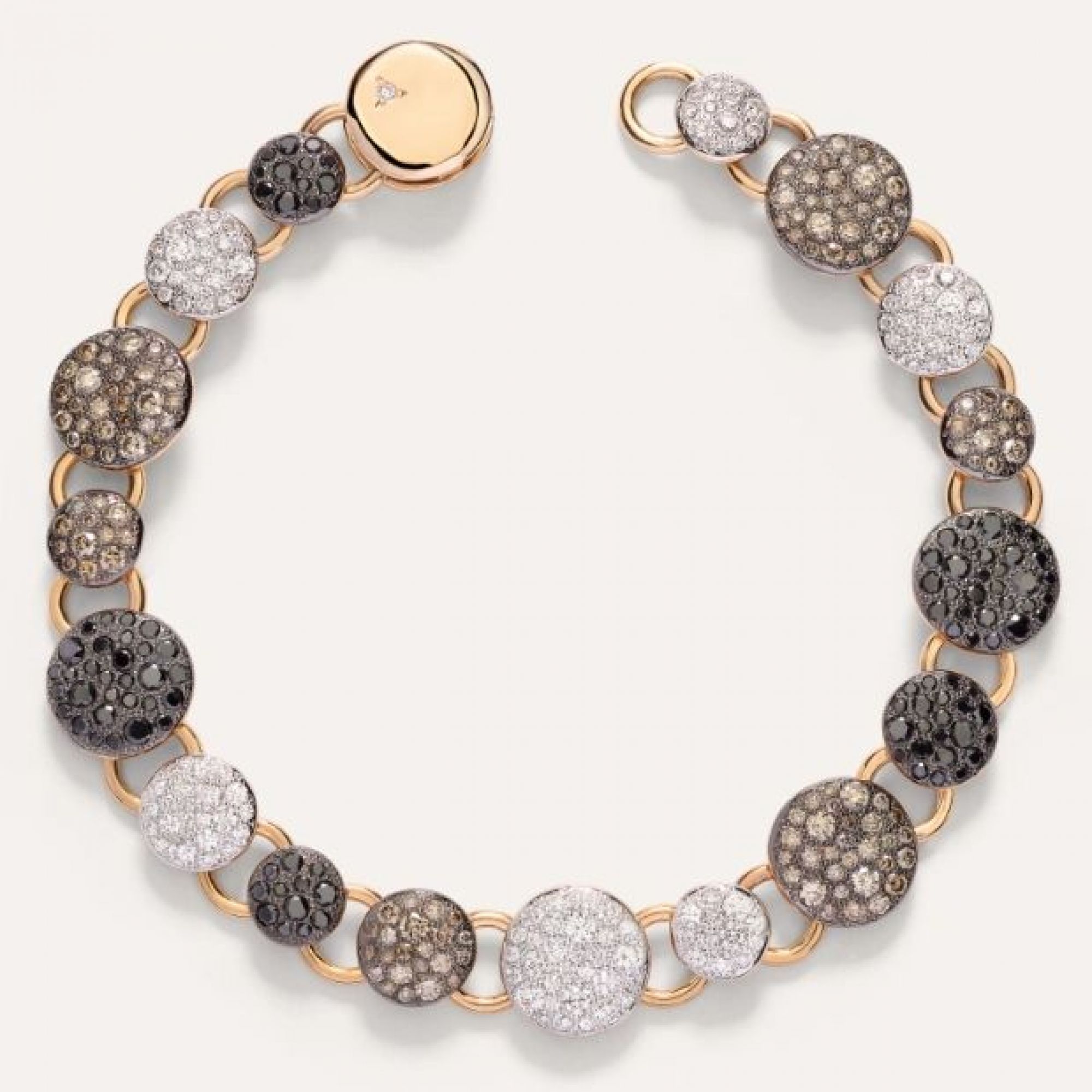 Sabbia erhält mit dem Armband aus Roségold einen schimmernden Look. Es ist eine harmonische Komposition aus Gliedern und weißen, braunen und schwarzen diamantbesetzten Medaillons.