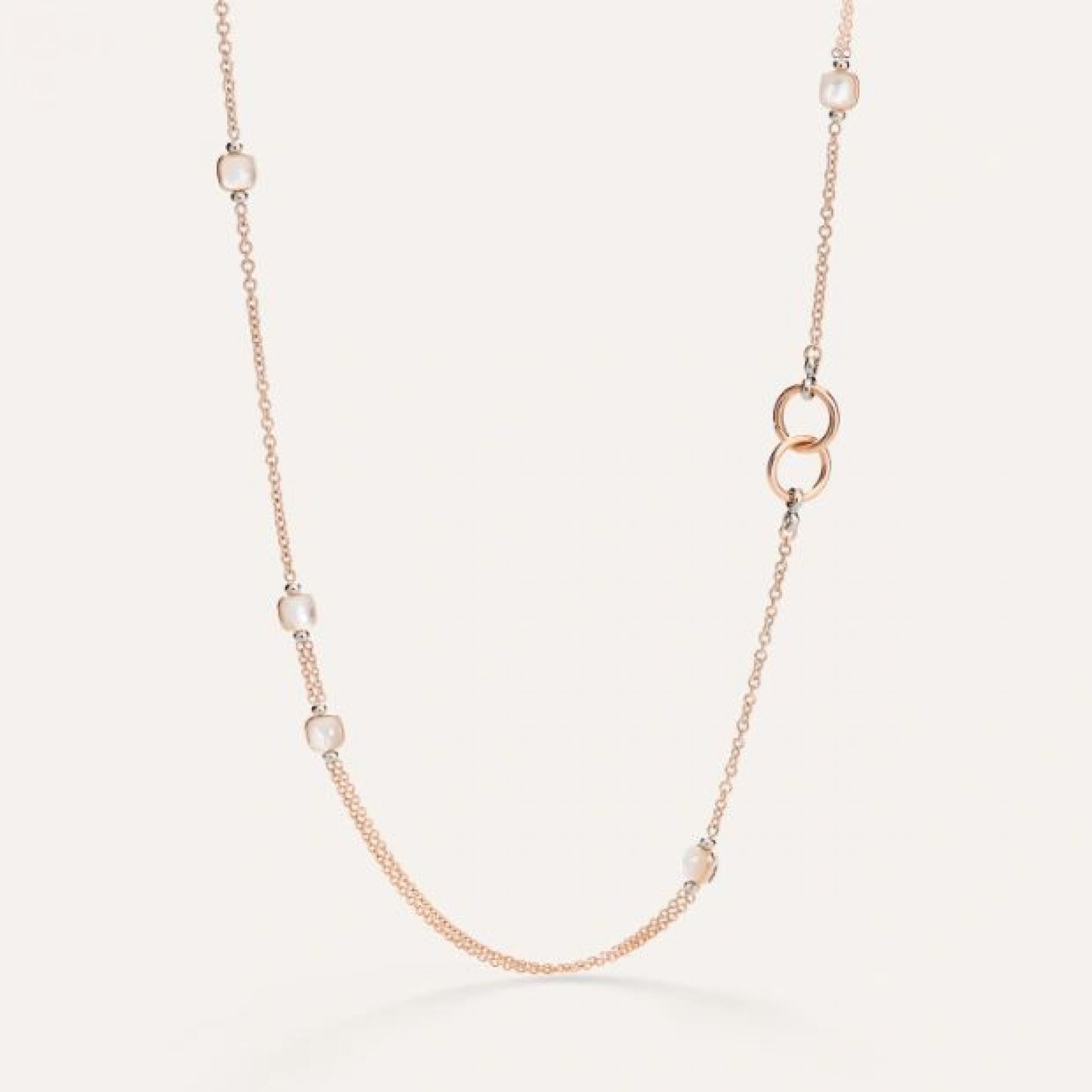 Erstmals erstrahlt NUDO in einer Halskette, die auf drei Arten getragen werden kann: als klassische Sautoir- oder als Lariat-Kette mit Anhänger, oder zweireihig um den Hals geschlungen. Erstmals zeigen die NUDO-Steine den zweiseitigen „Clessidra“-Schliff, mit dem sich die ganze Kostbarkeit dieses Edelsteins entfaltet.