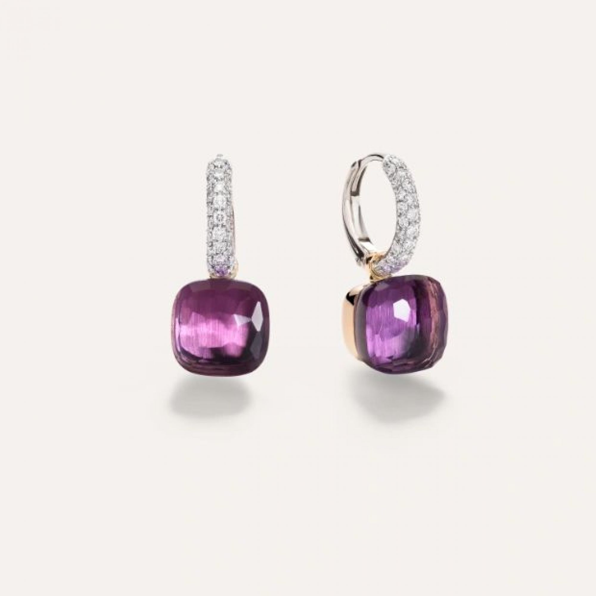 Ohrringe aus 18 Kt Weiß- und Roségold mit 2 Amethysten (≈13 ct) und 56 weißen Diamanten (≈0.5 ct) auf weiß rhodiniertem 18 Kt Weißgold.