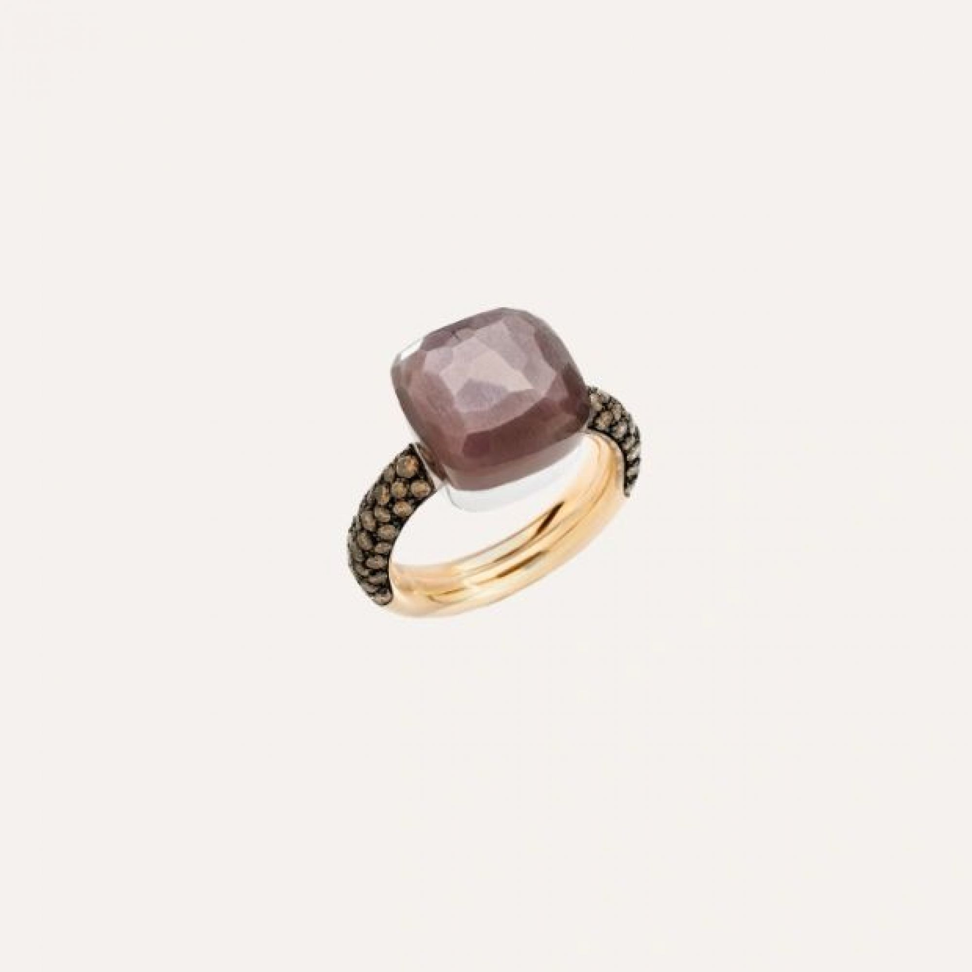 Pomellatos Leidenschaft für Farben zeigt sich in der Wahl herrlicher Schokoladentöne, die der Nudo-Farbpalette eine unkonventionelle Note verleihen. Völlig neue Konzepte und zeitgenössisches Schmuckdesign im unverwechselbaren Pomellato-Stil: Hier werden seltene Mondsteinvarietäten durch den Schimmer von Diamanten in drei verschiedenen Brauntönen veredelt. Der Ring in Maxigröße präsentiert sich mit einem geheimnisvollen dunkelbraunen Mondstein, der so verführerisch ist wie Schokolade mit dem höchsten Kakaogehalt.