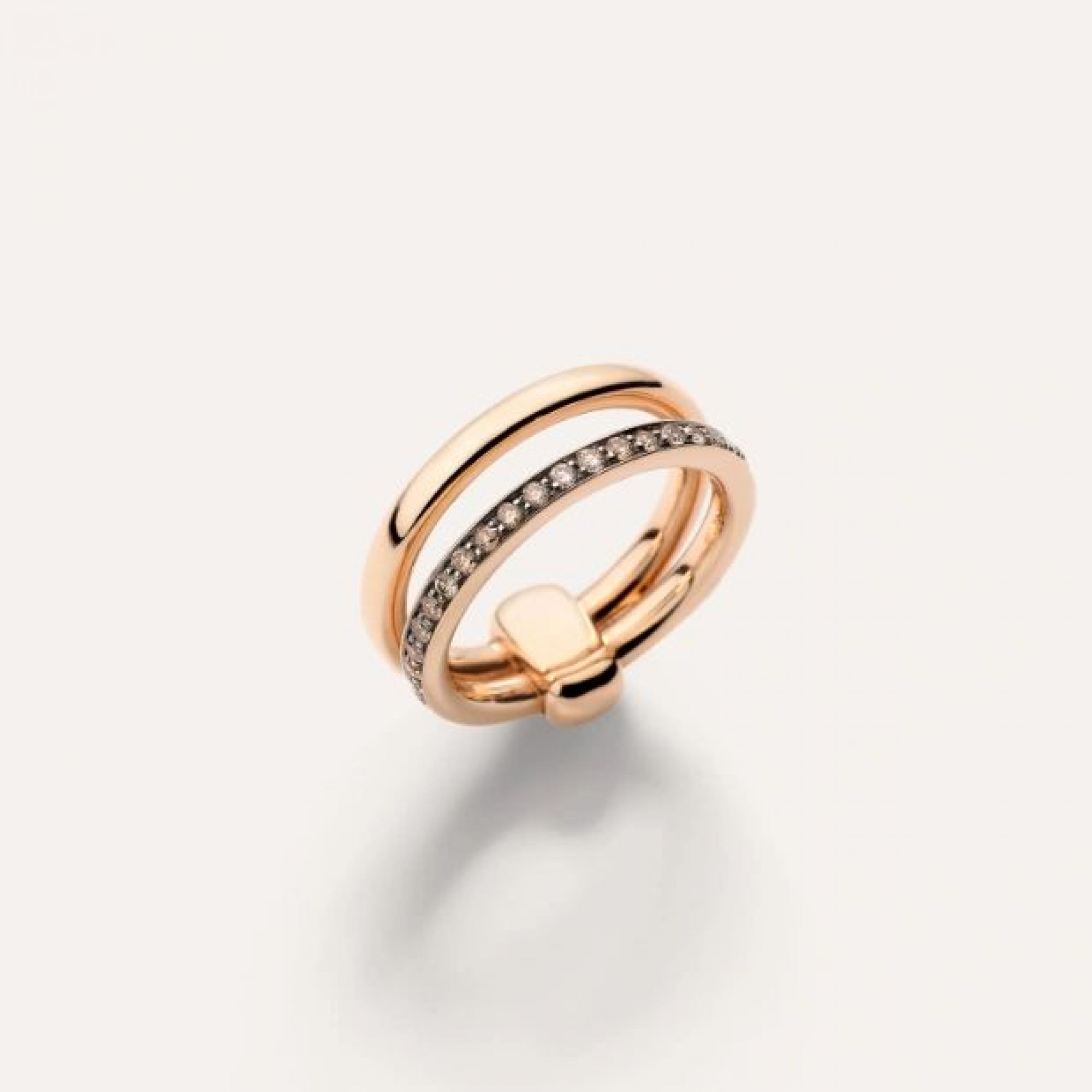 Die Doppelringe zeigen die schlichte Mailänder Eleganz von ihrer besten Seite: Zwei runde Goldspiralen werden durch ein flaches, quer verlaufendes Glied miteinander verbunden: Zwei perfekte und reine Formen sind für immer zu einem größeren Ganzen verbunden. Der Ring kann mit dem kostbaren Verbindungselement sichtbar auf der Vorderseite des Fingers oder versteckt auf der Rückseite getragen werden.