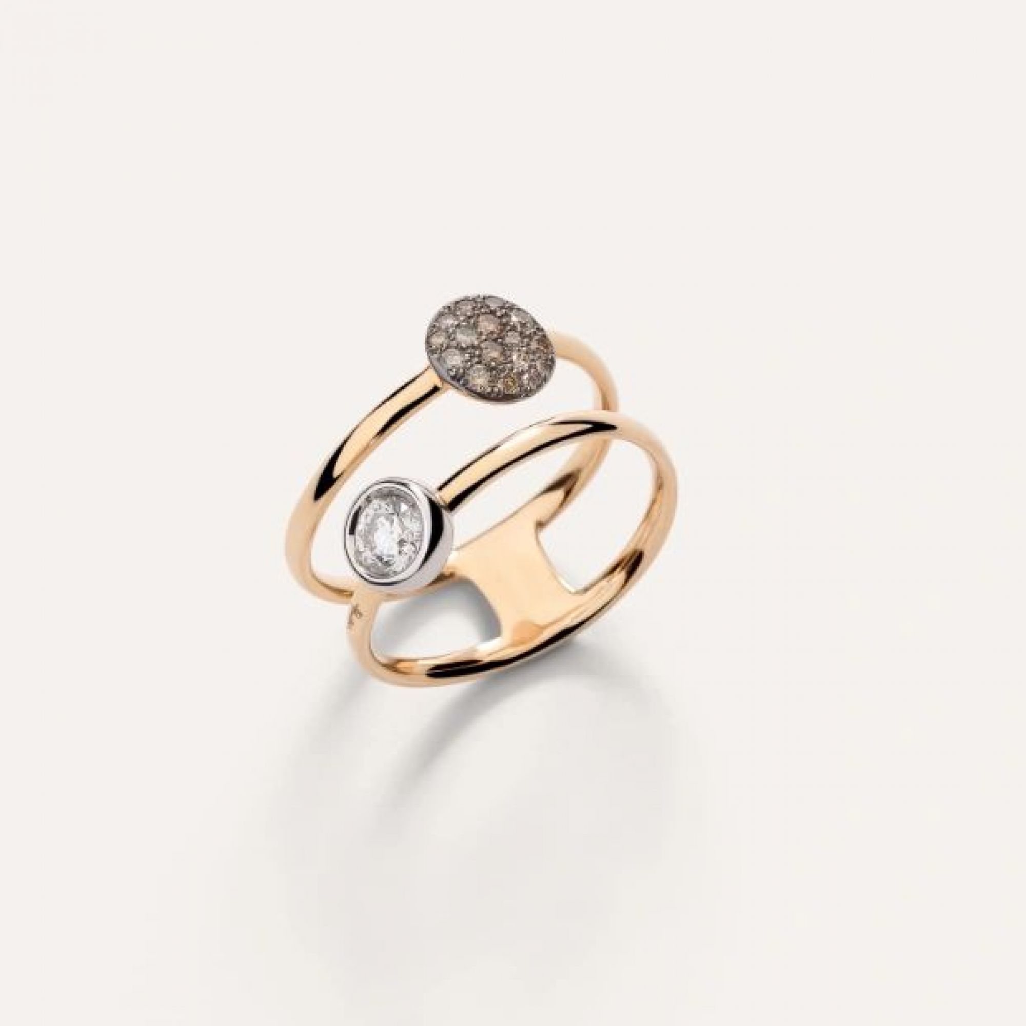Sabbia ist eines der charakteristischen Designs von Pomellato, das es wagt, Diamanten in einem ganz neuen Licht zu präsentieren. Sabbia zelebriert die unregelmäßige Schönheit der Natur und bietet verschiedene Möglichkeiten, Diamanten mit einer neuen, schicken Allure zu tragen. Der Reiz des unregelmäßigen Sabbia-Diamantenpavés trifft auf den Glamour von Diamantensolitären. Der Doppelring besteht aus zwei Bändern, die durch eine goldene Brücke an der Unterseite verbunden sind und mit einem Pavé aus braunen Diamanten und einem weißen Solitär-Diamanten verziert sind.