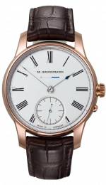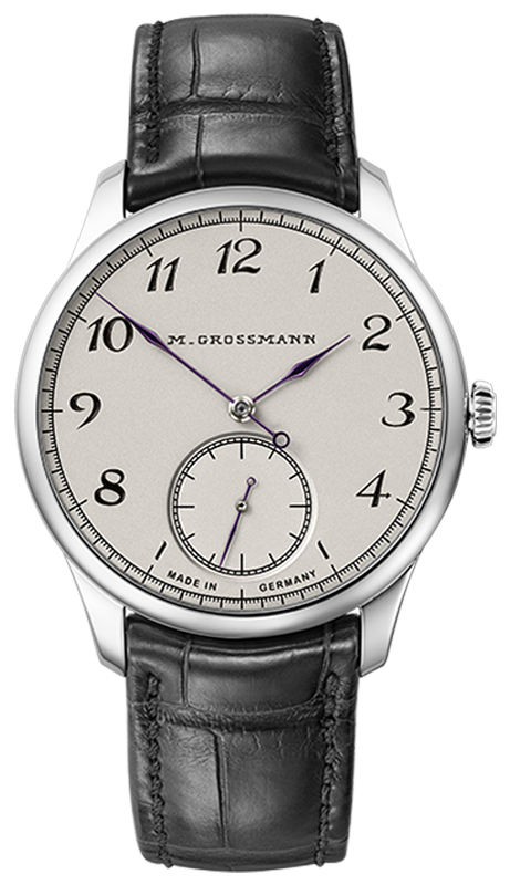 Als Wertschätzung seines unvergessenen und in Ehre gehaltenen Lebenswerks kommt sie zwar optisch in altem Gewand, aber mit neuerster Handwerkskunst im Innenteil daher. In Erinnerung an die beliebten klassischen Taschenuhren aus den versierten Händen Moritz Grossmanns fällt das historisch gestaltete Zifferblatt im Farbton Argenté sofort ins Auge, die schwarzen römischen Ziffern, das Originallogo aus dem Jahre 1875 und die Gangreserveanzeige in blau-weiß runden die Hommage an den alten Meister stilvoll ab. Eine ursprüngliche Legende, die nun auch in der Moderne wieder jedes Handgelenk als zeitloses Kunstobjekt schmückt.